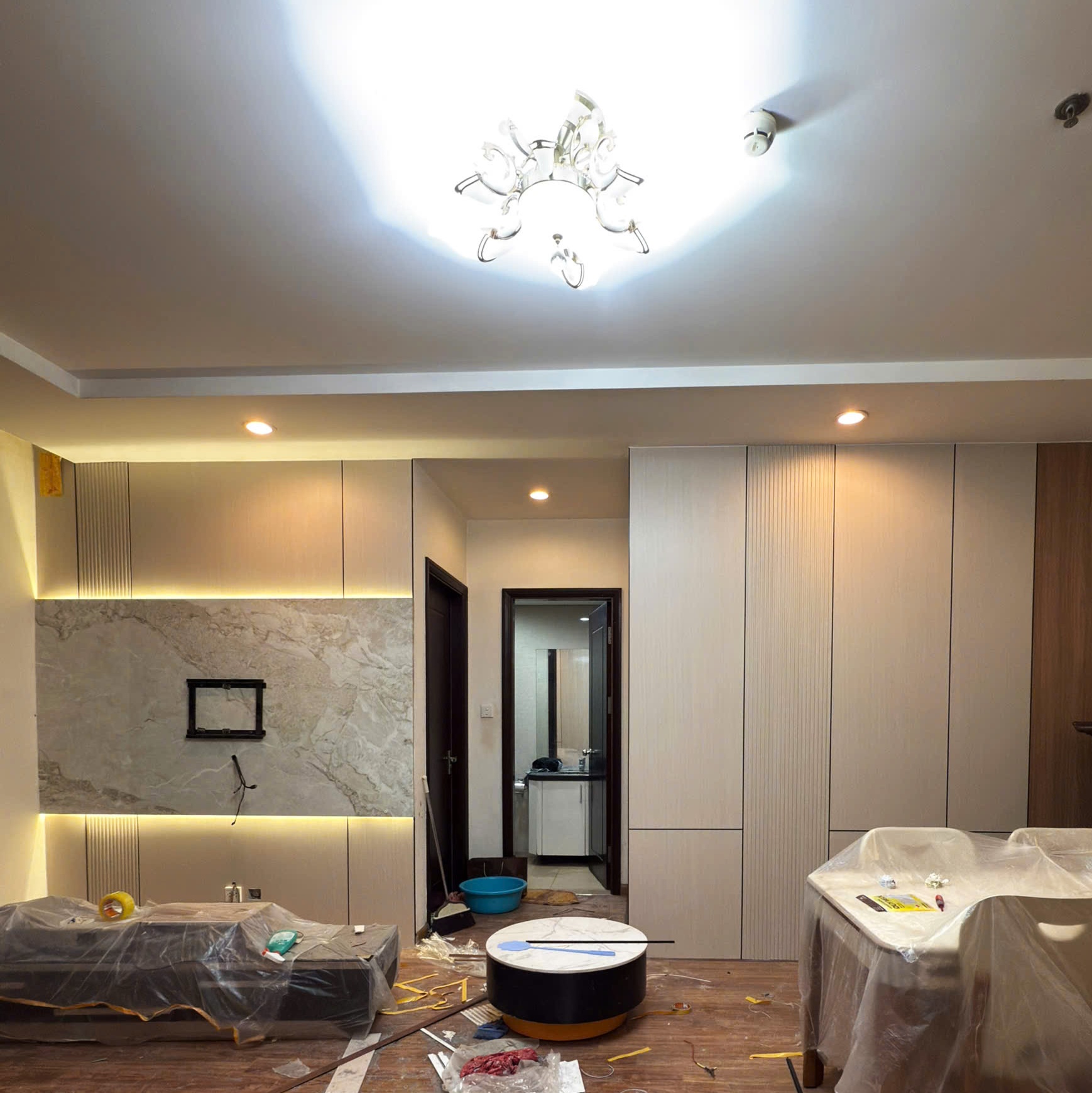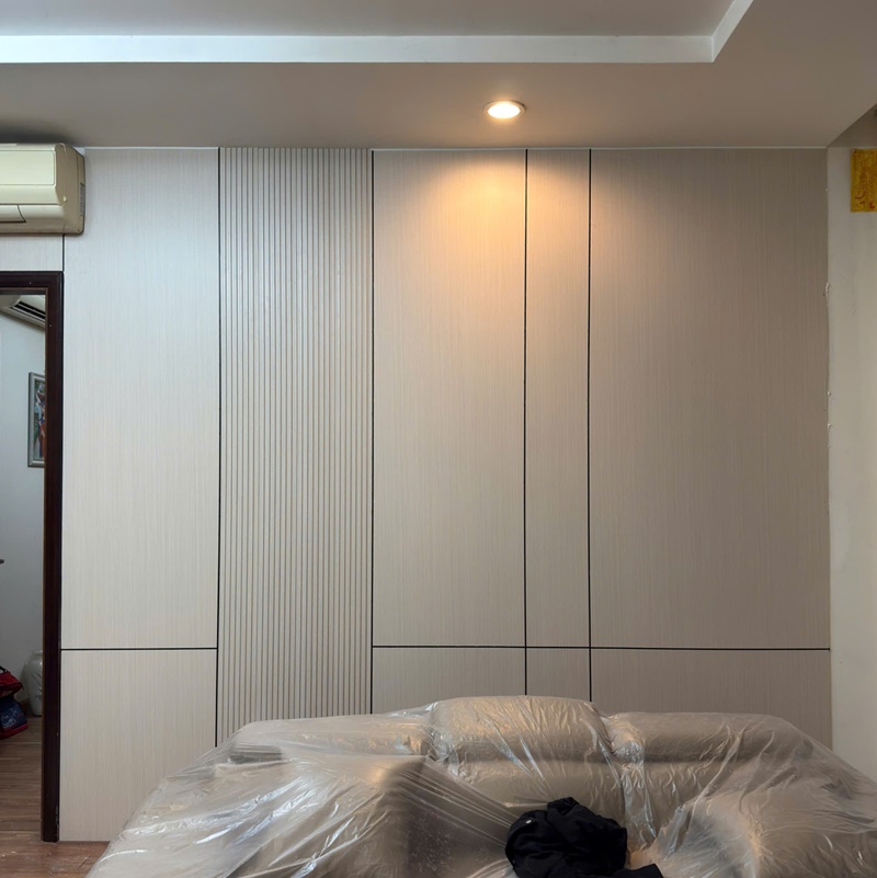 Các đường lam sóng chạy dọc được đơn vị thi công xử lý rất chuẩn, kết hợp cùng ánh đèn downlight tạo nên hiệu ứng bóng đổ mềm mại, giúp không gian vốn đơn giản trở nên có hồn và giàu chiều sâu thẩm mỹ.