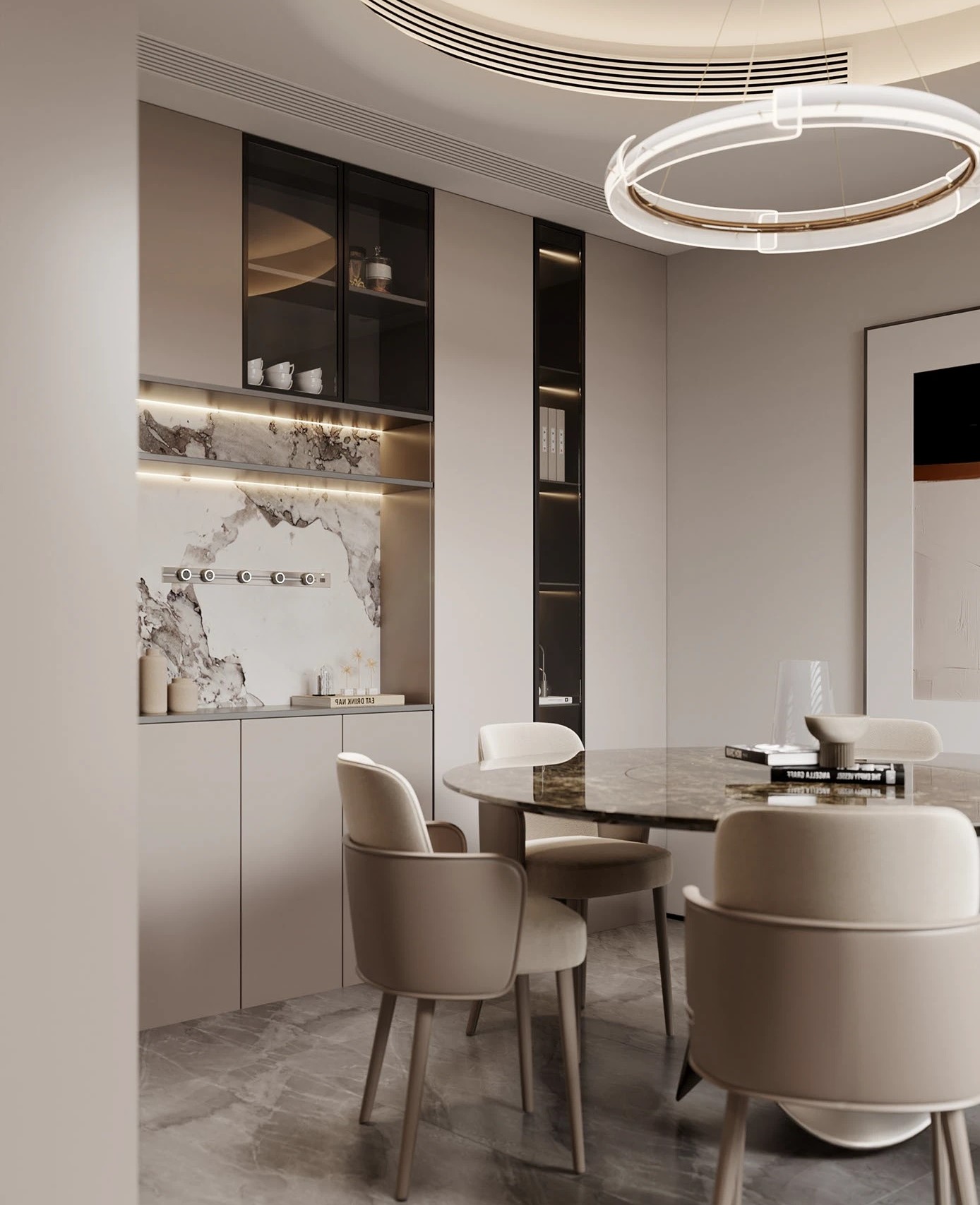 -> Gợi ý: Kết hợp ánh sáng hắt để làm nổi bật vân ốp.